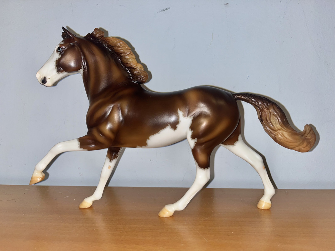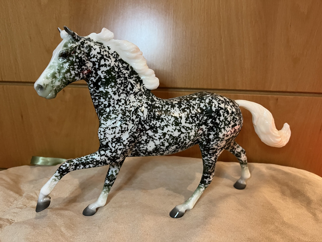 On Monday I’m leaving for 18 days, and it would have been such a bummer to wait that long to get my model. She’s really beautiful in person, and the dapples really pop. I noticed that there is no VIN code under the hoof! When I first saw this model in the Premier Club sneak peeks, I never imagined I would end up with the OOAK glossy version. It feels amazing to have such a rare model in my collection.